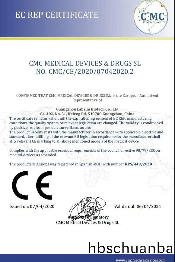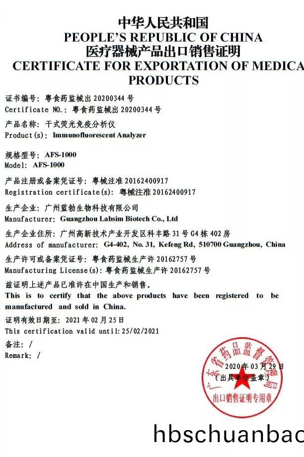 藍勃生物榦式熒光免疫分析(xi)儀AFS-1000穫歐盟CE準入咊醫療器械産品齣(chu)口銷售(shou)證明。